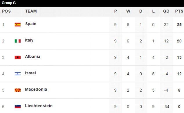 ၂၀၁၈ ကမၻာ႔ဖလားေျခစစ္ပဲြ ဥေရာပဇုန္ပဲြစဥ္ေတြကုိ ဆက္လက္ယွဥ္ၿပိဳင္ ကစားခဲ့ၿပီး အယ္လ္ေဘးနီးယားကုိ အႏုိင္ရခဲ့တဲ့ စပိန္အသင္း တိုက္႐ုိက္ ေျခစစ္ပဲြေအာင္ျမင္ခဲ့ေပမယ့္ ခ်န္ပီယံဆု(၄)ႀကိမ္ရ အီတလီအသင္း ကေတာ့ ဒုတိယေနရာနဲ႔ေက်နပ္ခဲ့ရလုိ႔ play-offs ထပ္မံ ကစားရမွာျဖစ္ပါတယ္။ အုပ္စု(G)မွာ ထိပ္ဆုံးေနရာအတြက္ အၿပိဳင္ျဖစ္ေနတဲ့ စပိန္နဲ႔ အီတလီ အသင္းတို႔ဟာ အယ္လ္ေဘးနီးယား၊ မက္ဆီဒုိးနီးယားတို႔နဲ႔ ဆုံေတြ႕ခဲ့ ၿပီး စပိန္အသင္းက အမွားအယြင္းမရွိ အႏုိင္ယူခဲ့ေပမယ့္ အီတလီအသင္း ဟာ အိမ္ကြင္းမွာ မက္ဆီဒုိးနီးယား မထင္မွတ္ဘဲ သေရက်ခဲ့လုိ႔ စပိန္နဲ႔(၅)မွတ္ ကြာဟသြားတာေၾကာင့္ ဒုတိယေနရာနဲ႔ပဲ ေက်နပ္ခဲ့ရတာပါ။ စပိန္ အသင္းဟာ အယ္လ္ေဘးနီးယားကုိ ႐ုိဒရီဂုိ(၁၆)၊ အစၥကုိ(၂၃)၊ သီယာဂုိ အယ္လ္ကန္တာရာ(၂၆)တို႔ရဲ႕ သြင္းဂုိးေတြနဲ႔ အႏုိင္ယူခဲ့တာျဖစ္ပါတယ္။ အီတလီ-မက္ဆီဒုိးနီးယားပဲြမွာေတာ့ အီတလီအသင္းက မိနစ္(၄၀)မွာ ခ်ီလီနီရဲ႕ ဂုိးနဲ႔